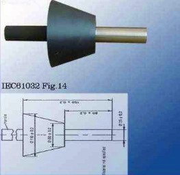 產(chǎn)品概述:符合IEC61032圖10試具14要求,用于檢驗通過電氣插座的防護(hù)外罩能否觸及內(nèi)部的危險帶電部件,配尼龍手柄。