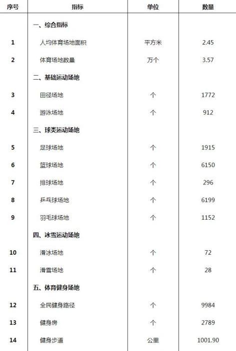在冰雪運(yùn)動場地中,滑冰場地72個,滑雪場地28個。另外,健身房共有2789個,健身步道長達(dá)1001.90公里。
