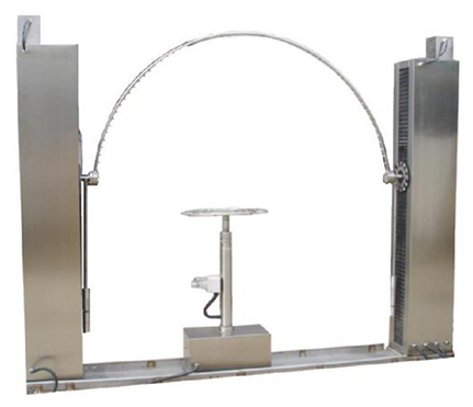1. 擺管式濺水試驗(yàn):選擇適當(dāng)半徑的擺管,使樣品臺(tái)面高度處于擺管直徑位置上,將試樣放在樣臺(tái)上,使其頂部到樣品噴水口的距離不大于200mm,樣品臺(tái)不旋轉(zhuǎn)。水流量按擺管的噴水孔數(shù)計(jì)算,每孔為0.07L/min;噴水面積為擺管中點(diǎn)兩邊各90°弧段內(nèi)噴水孔的噴水噴向樣品。被測(cè)樣品放在擺管半圓中心。擺管沿垂線兩邊各擺動(dòng)180°,共約360°。每次擺動(dòng)(2X360°)約12s,連續(xù)試驗(yàn)10min。
