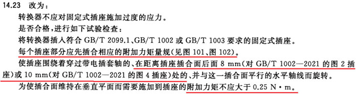 與GB/T 2099.3-2015相比,新版標(biāo)準(zhǔn)在術(shù)語和定義、標(biāo)志、結(jié)構(gòu)、溫升等章節(jié)存在技術(shù)變化。今天主要介紹第14.23條款轉(zhuǎn)換器力矩測(cè)試,新版標(biāo)準(zhǔn)測(cè)試方法引入測(cè)試用插頭量規(guī)來代替試驗(yàn)插頭,具體情況如下: