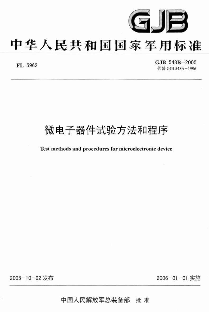 GJB548《微電子器件試驗(yàn)方案和程序》規(guī)定了軍用微電子器件的氣候環(huán)境試驗(yàn)、機(jī)械環(huán)境試驗(yàn)、電學(xué)試驗(yàn)和檢驗(yàn)程序,以及為保證微電子器件滿足預(yù)定用途所要求的質(zhì)量和可靠性而必須的控制措施和限制條件。標(biāo)準(zhǔn)適用于軍用微電子器件。