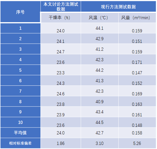 風(fēng)溫和風(fēng)量是影響干燥性能的兩個(gè)重要因素,但影響機(jī)理不得而知。本問(wèn)討論的試驗(yàn)方法,即直接測(cè)量法。通過(guò)考核暖風(fēng)干燥的最終結(jié)果,而不是考核影響暖風(fēng)干燥效果的成因,來(lái)評(píng)價(jià)暖風(fēng)干燥性能,方法更加科學(xué)、有效,并更加貼近于消費(fèi)者的真實(shí)使用情況。